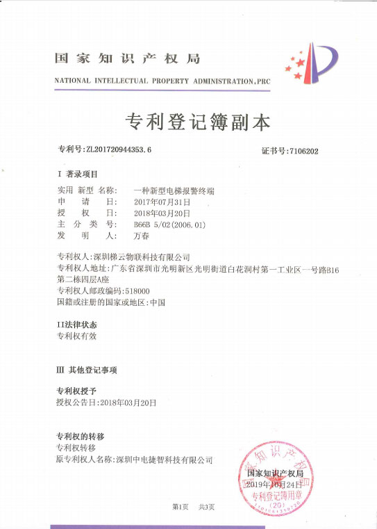 專(zhuān)利 電梯報(bào)警終端專(zhuān)利證書(shū)